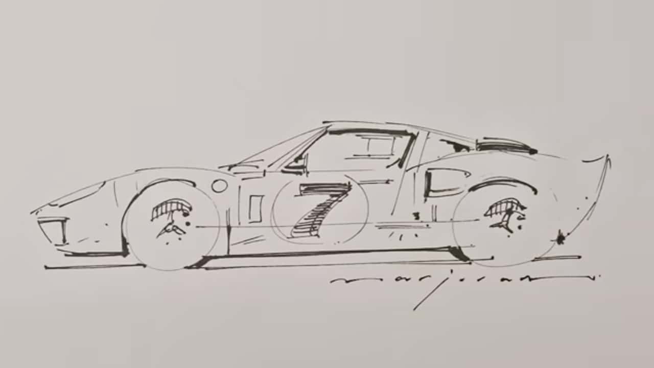 From there, Marjoram quickly begins to develop the rest of the vehicle with his pen. The Ford GT40 starts to take shape courtesy of its front and rear fender lines. Next comes the low roof, and the iconic silhouette appears before you.